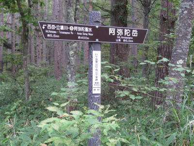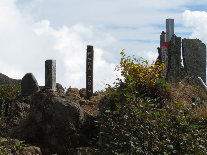 登って行くとこの日初めての登山者がいて、展望台の道標が有る、ここから阿弥陀岳への最後の急斜面が見える、ヘルメットをかぶった登山者の方は登山口に停めてあったバイクの持ち主で、何と横浜からバイクで来たようだ、6時くらいに船山十字路を出発してすでに阿弥陀岳に登って来られたようだ。