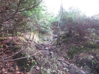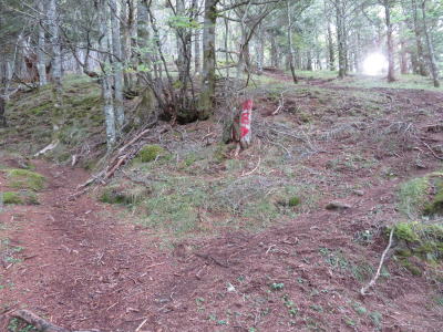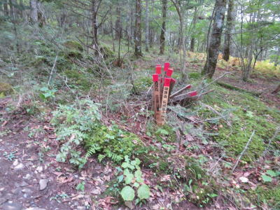 この辺りの登山道は踏み跡が沢山有ってどれが正しい道か解らない、何処を歩いても上を目指せば大丈夫にも見えるが、例の赤い板の有るのが目安に成る。