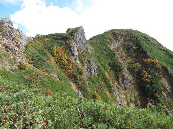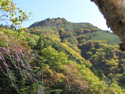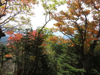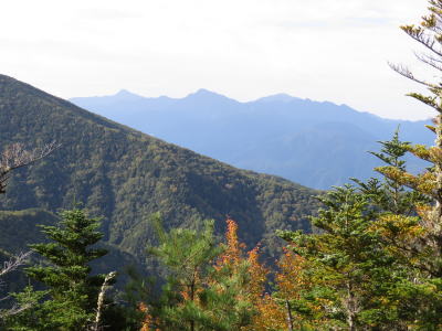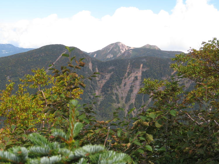阿弥陀岳に向かって最後の急登に踏み出す、森林限界を超えたのか展望が開けて来る、下の方は昨日の雨で湿っていて滑りやすかったが、標高が上り木が少なく成ったので乾きが速いようだ、斜面は急なので、ハイマツの幹や根、岩角などに捕まって三点確保で登って行く、それほど怖さは感じない、むしろ展望が開けてくるのが嬉しい。
