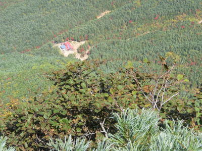 登って来た御小屋尾根を下る | 行者小屋が見える |