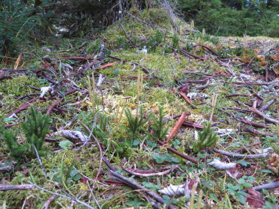 樹林の間から南アルプスの山が見える | 八ヶ岳らしい苔の道 |