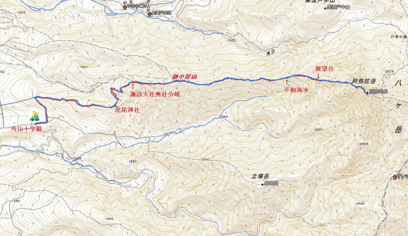 10:05 展望台 10:22 -(1:12)- 11:34 阿弥陀岳山頂 12:35 -(0:54)- 13:29 展望台 13:42 -(0:28)- 14:10 不動清水 14:16 -(0:36)- 14:52