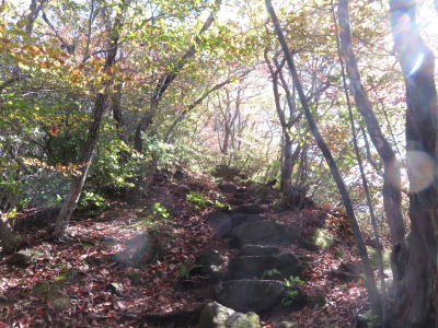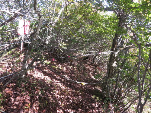 相馬山は裏からの、今日のコースで一度、前からの、森林公園から一度登っている、東の方の先に行けば森林公園からの道があるはずなので行ってみると、ロープが張られて閉鎖されている、前来た時もこんなだったかかも、急な斜面に大きな一枚岩が有って鎖が付けられていたような。