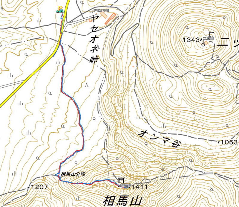 ヤセオネ峠駐車場 9:26 -(0:22)- 9:48 相馬山分岐 9:55 -(0:28)- 10:23 相馬山山頂 12:57 -(0:26)-