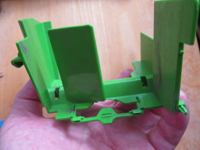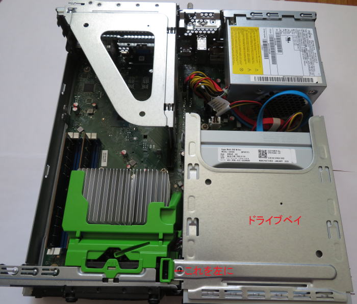 緑のプラスチックの留め金(プラスチック)を左にずらしてドライブのベイを上に持ち上げると、右をヒンジに90度くらい開いて、つっかい棒が出て引っ掛かります、良くできてますね。