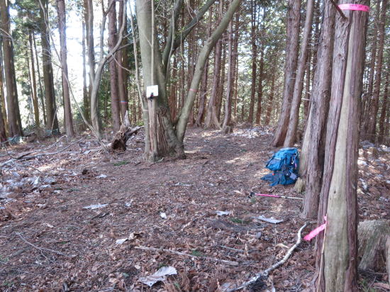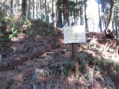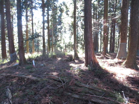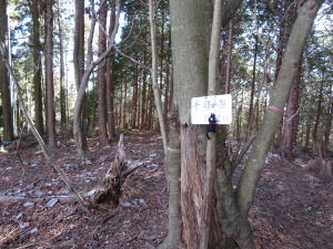 歩いていくと左の先の方が高くなっていて山頂らしいので、途中から尾根に登り先に進むと杉林の中に三角点と山頂標識が有る、風が強く寒いがせっかく登った山頂なので三脚を出してアンテナをセットする、1200MHz で CQ を出すと、何度か交信していただいている春日部市の局が応答してくれた。