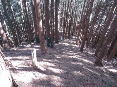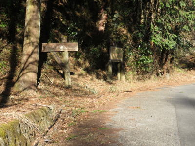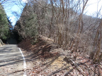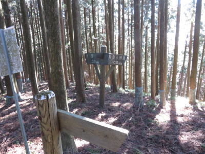 ほぼ平らな尾根を行くと道標が有る、左の観音入林道の方に行けば良かったのだが、尾根に沿って行くと斜面は下ってしまう、左に向かえば林道が有るはずなので左に行くと下に舗装された林道が見えた。