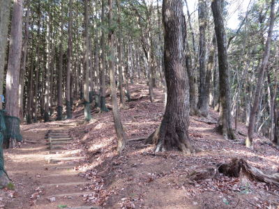 登山道は丸太の階段が付けられていて良く整備されている、登って行くと山の神という看板が有り階段が有るが先には石灯篭が有るだけで道はない、戻って先に行くと、右に尾根を登るルートが有り、丸太の階段も付けられている。