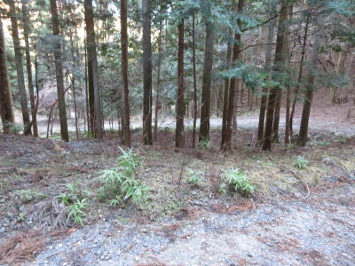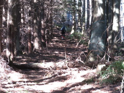剣ヶ峰に行くのには東側に有る林道に続く尾根を下る必要が有るので、行き過ぎないよう左の尾根を見ながら進みました、それらしい場所が有ると確認してから、尾根を下ります、下って行くとかなり急な尾根で、下の方に林道が見えて来た。