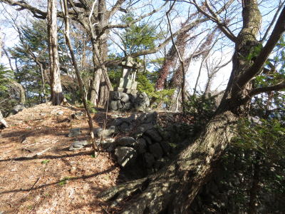 煩わしい藪を行くと剣ヶ峰の大きな石祠が見えて山頂に立つ、ここは南側が開けていて今日一番の山頂だ。