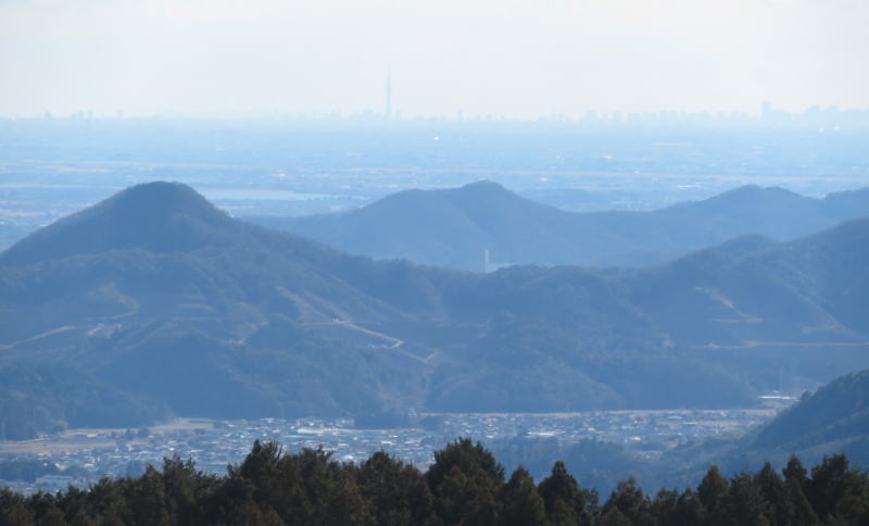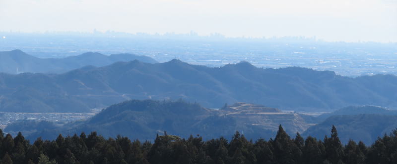 左の山はアド山でしょうか、その先に渡良瀬遊水地らしい湖が、右の山は唐沢山みたいで、手前に葛生の清掃センターらしいエントツも見えます。