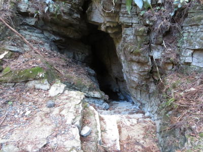 観音入林道と合流し下って行くと、車が一台下って行く、そして右側に洞窟が有る。