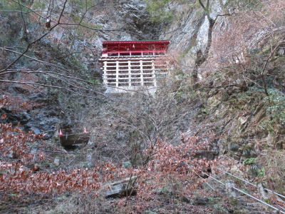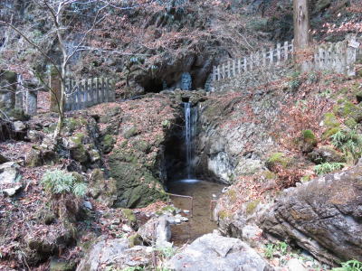 さらに下ると右の斜面に満願寺の奥之院が見え、手すりの有る奥之院に下る道が有るので下って行くと、滝が有る、ここで滝行が出来るようだ。