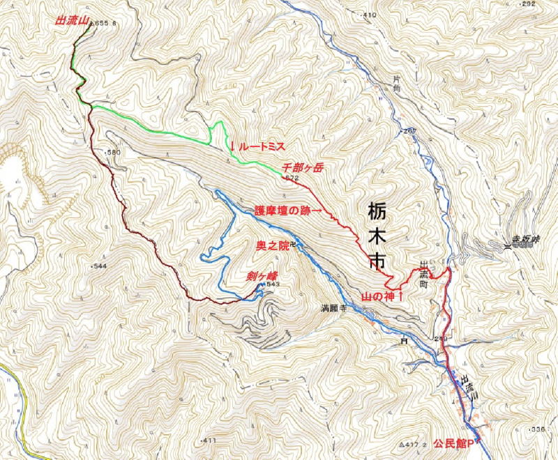展望が期待できない山なので、近くの出流山(656m)と剣ヶ峰(543m)を縦走する事に、YAMAP から地図を落としておく。