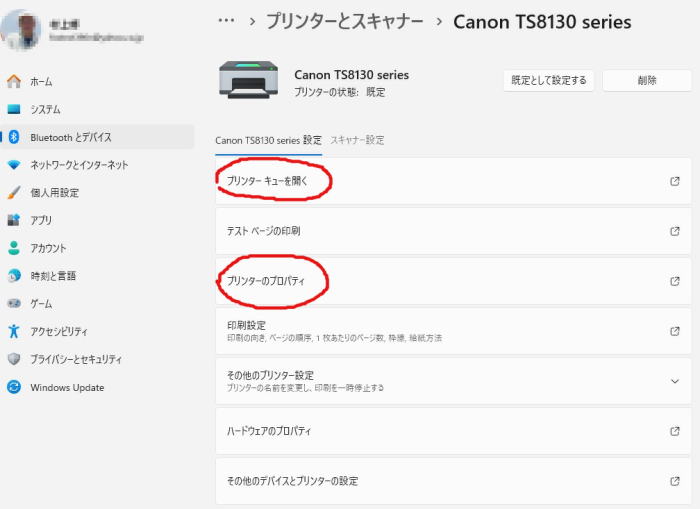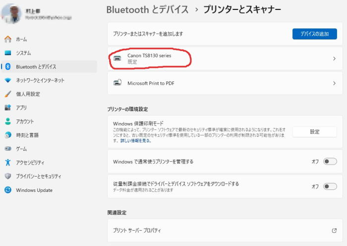スタートメニュー🪟から設定🔅を開き、🖨️プリンターとスキャナーを開くと設定したプリンターが出ます。