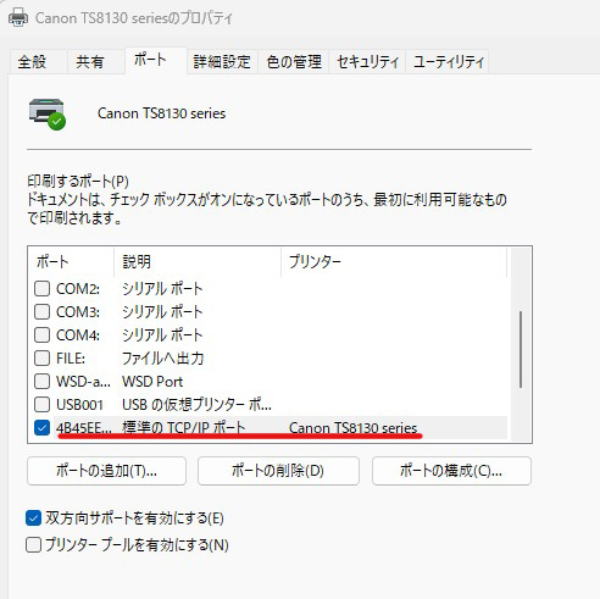 プリンターのプロパティを開きポートを開くと WSD-*** というのが有りますがノートPC に有る標準の TCP/IP ポートというのが有りません。